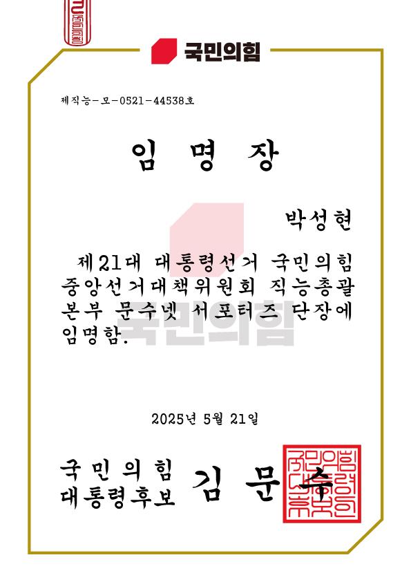 문수넷 박성현 운영위원 선대위 임명장